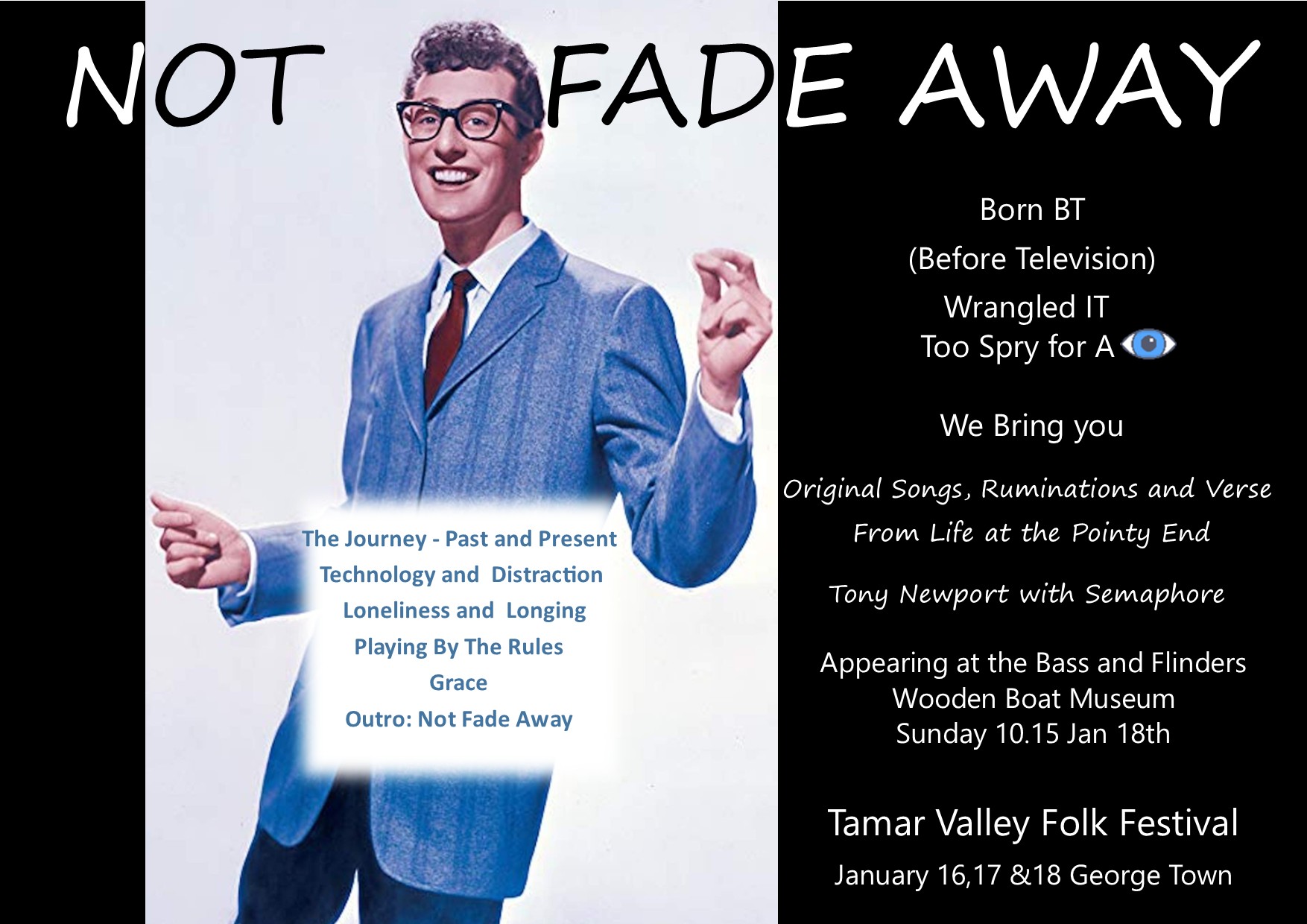 Not Fade Away is a themed concert. We are appearing at theTamar Valley Folk Festival January 16, 17 & 18th, 2026; at 10.15am on the Sunday. The TVFF is a wonderful festival check out the performers and program here: https://tamarvalleyfolkfestival.com/